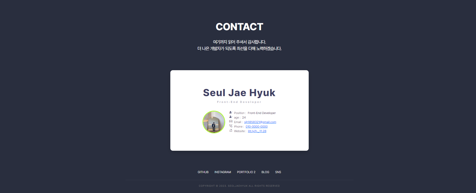 - 'GITHUB, INSTAGRAM, PORTFOLIO 2, BLOG, SNS' 를 개별 텍스트로 입력하여 텍스트 클릭시 해당 사이트로 이동하게 구현하였다.