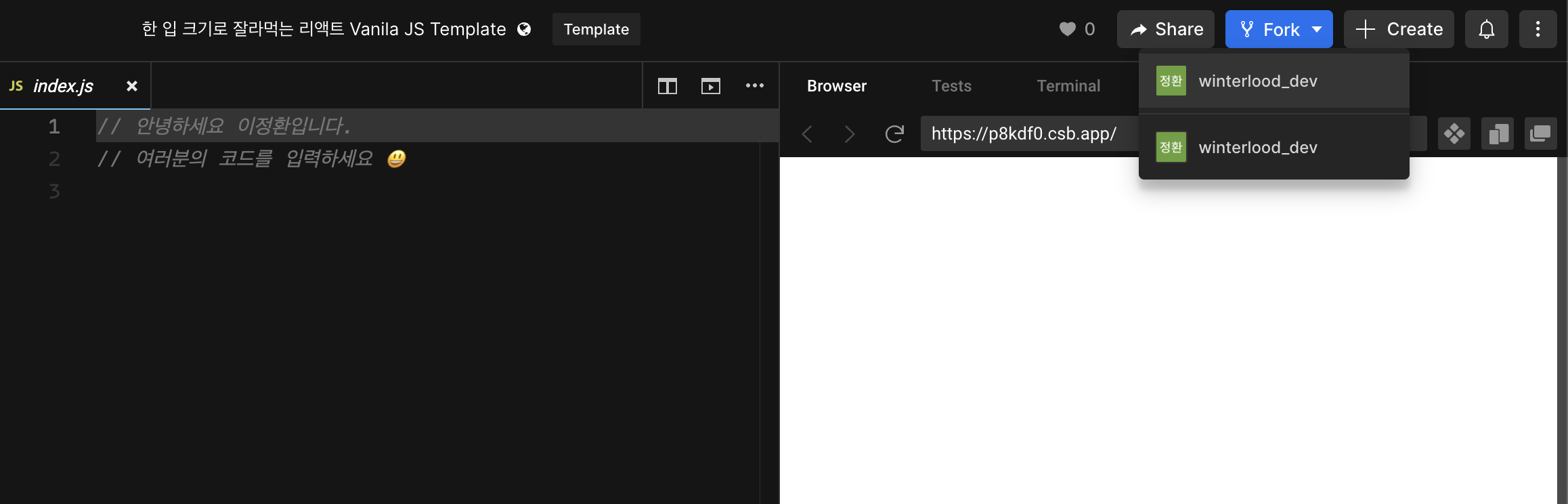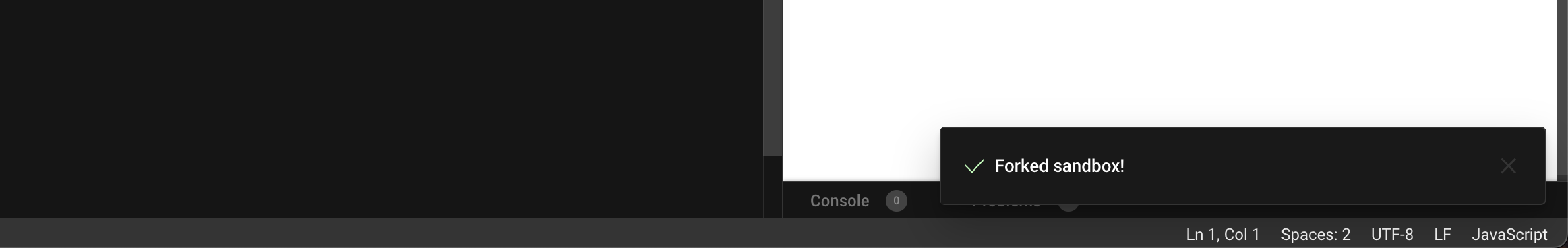 그럼 다음과 같이 페이지 우측 하단에 "Forked Sandbox"라는 메세지가 나타납니다.