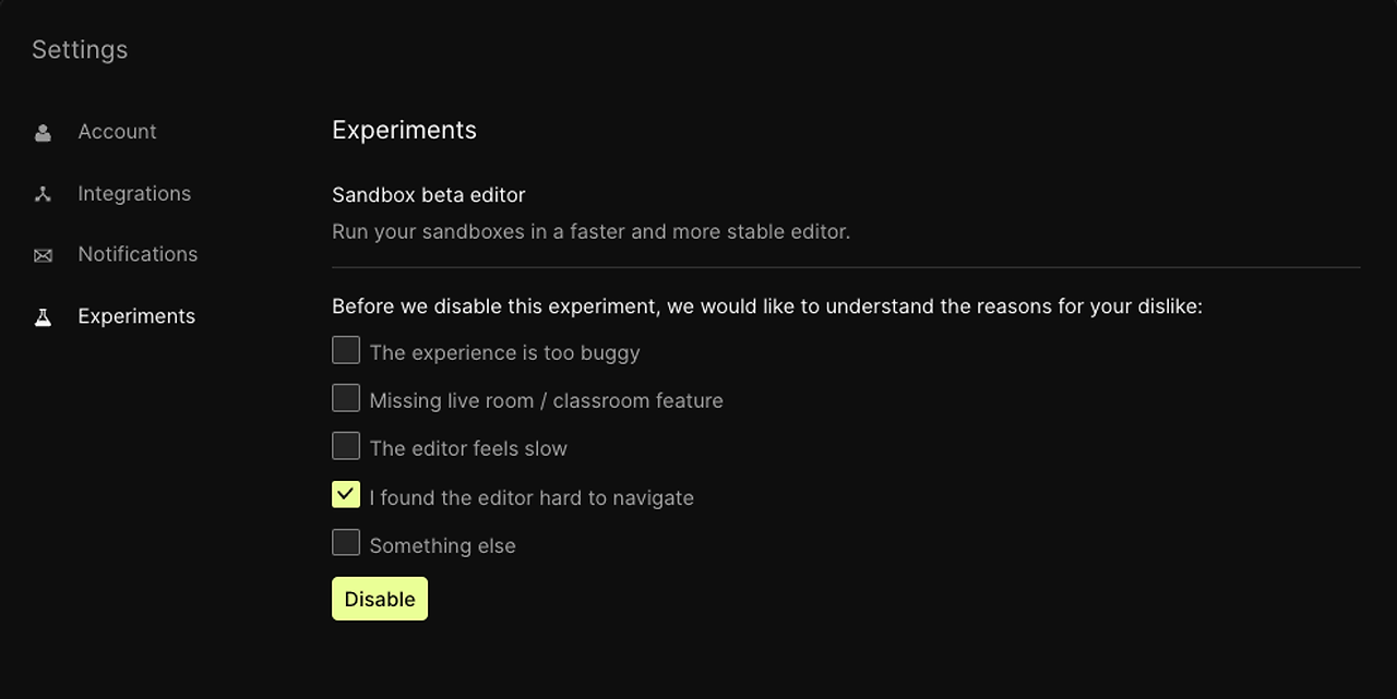 7. 여기서 Sandbox beta editor 옵션의 스위치를 아예 꺼 주시면 됩니다.