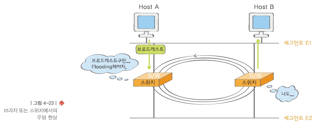 - 프레임이 네트워크상에서 무한정으로 뱅뱅 돌기 때문에 이더넷의 특성상 네트워크가 조용해야 데이터를 전송할 수 있는 다른 녀석들이 계속